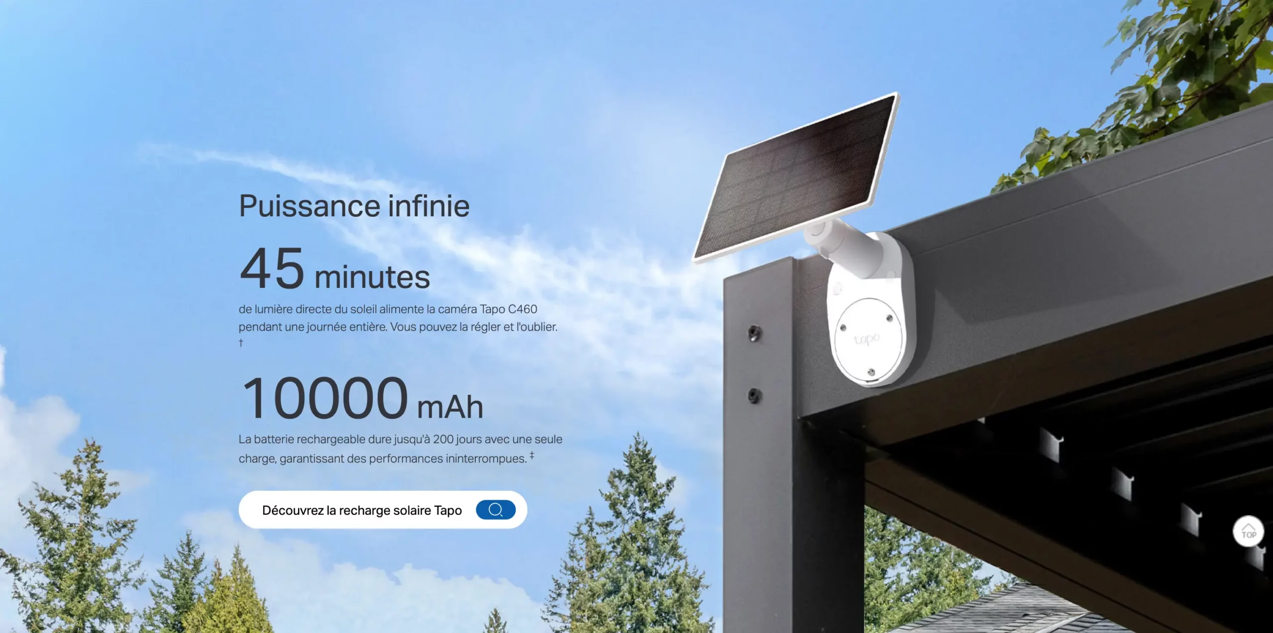 | Source d'alimentation | 10000 mAh Built-in Rechargeable Lithium-ion Battery Solar Panel: Tapo A201 |