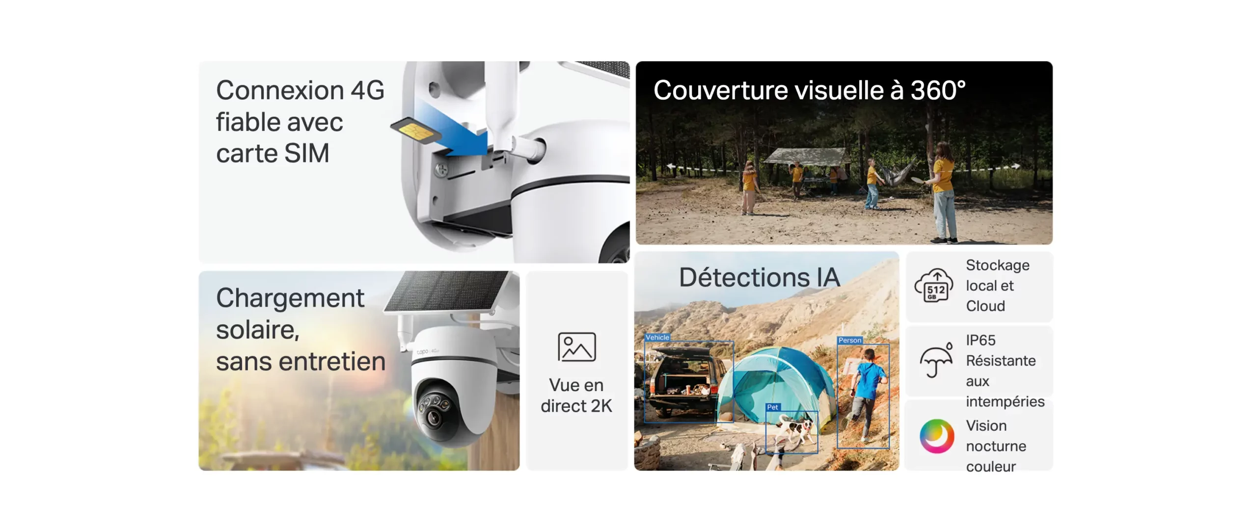| Contenu de la boîte | Tapo C615G Camera Tapo A201 Solar Panel × 1 Tapo A201 Solar Panel Bracket × 1 Base Cover × 1 Detachable Antenna × 1 USB Adapter Cable × 1 Extension Wire × 1 Mounting Screws and Anchors Mounting Template Stickers × 2 Quick Start Guide |